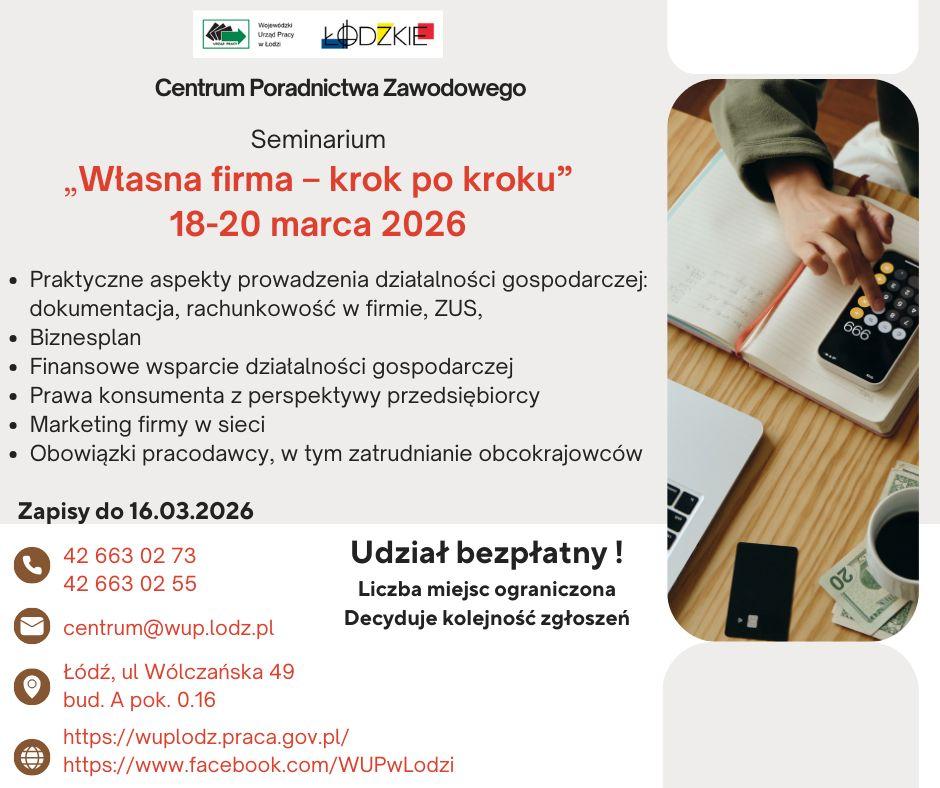 Powiatowy Urząd Pracy w Skierniewicach informuje, iż Wojewódzki Urząd Pracy w Łodzi organizuje w dniach 18-20 marca 2026 roku 39. edycję seminarium „Własna firma – krok po kroku”, które kierowane jest m.in. do osób bezrobotnych planujących rozpoczęcie działalności gospodarczej.